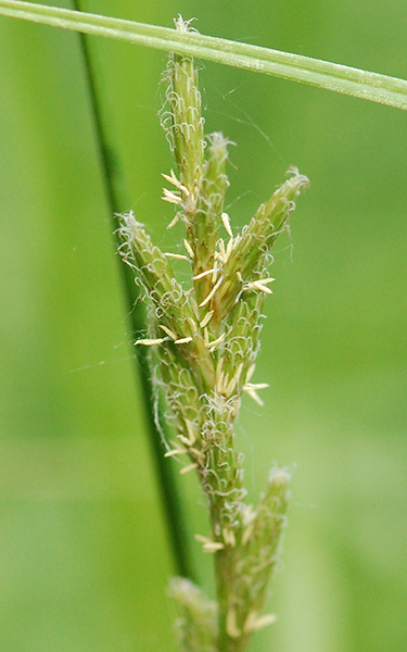 Below: 1st photo - a developing inflorescence with 7 spikes, illustrating the shape. 2nd photo - drying mature perigynia with the achene inside. 3rd photo - a culm in flower.