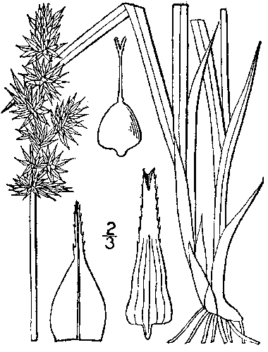 Below: Drawing of the leaf sheath (front view) and spike by Harry C. Creutzburg, ©Kenneth Kent Mackenzie (1940) North American Cariceae
