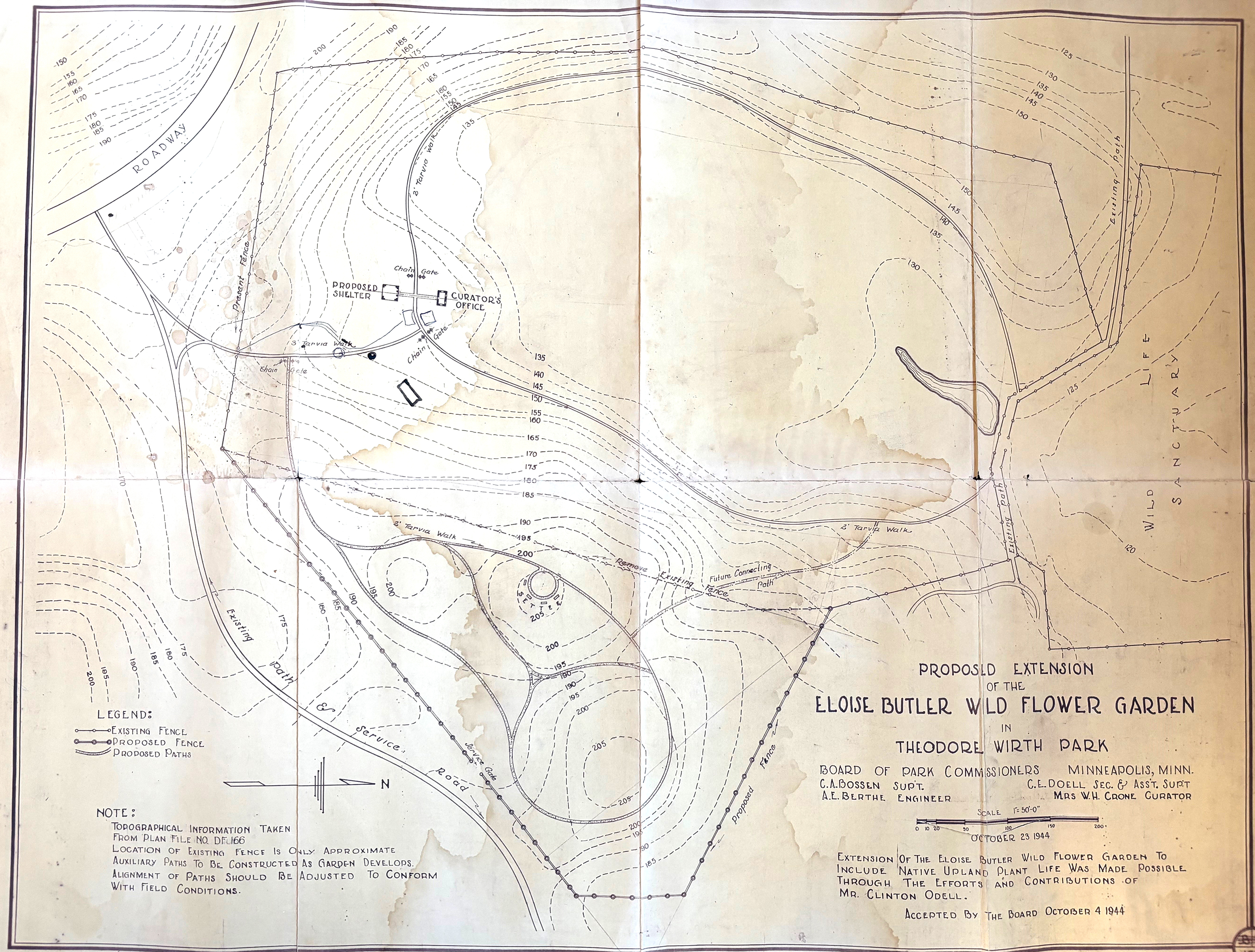 By these dates most or all of the 1939 fence had been removed. When Clinton Odell proposed to the Park Board in 1944 to add the current upland area to the Eloise Butler Wild Flower Garden, Martha Hellander’s research found that Odell said to the Park Board that the northern area (which included the Mallard Pool) should never have been fenced and that it was swampy and should be abandoned in favor of an upland area which the garden did not have at that time (1 pg. 104). In an exchange of letters in 1944 to Odell from Park Board Secretary Charles Doell and from Superintendent C. A. Bossen, the Park Board agreed with parts of his proposal, including the funding that he proposed. (more details in The Upland Addition to the Eloise Butler Wildflower Garden, Garden History Archive).