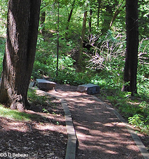 Photo top of page: The wetland pool area in the back of the Garden - path with granite seats installed in 1993. Photo from 2008 ©G D Bebeau