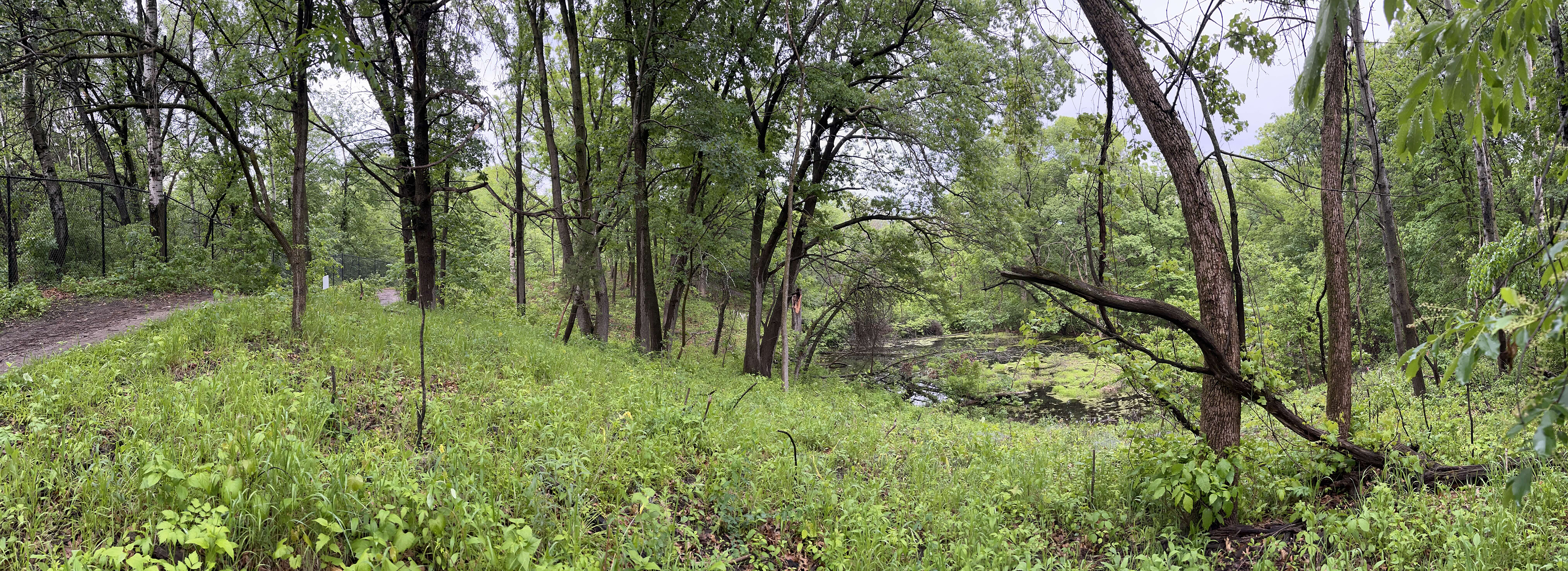 Below: Summer 2025. This panoramic photo shows the entire hillside down to the pond with the corner of the new Garden fence at the left. Photo Jim Proctor